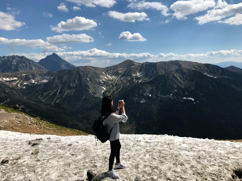 海拔高度1987公尺的 Kasprowy Wierch 風景非常的美麗,雖然當天是大晴天,不過六月初到山上還是蠻冷的,好在我們有準備 Uniqlo 輕羽絨外套防寒才能待久一些,沿著稜線走了一小段並拍照留念,稜線上有許多石子路,建議還是要準備一雙防滑的鞋子比較安全。