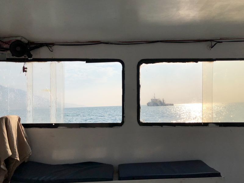 繞了大坵島一圈,島上其實就光禿禿的。沒太多的高大植物,建築物也不多;如果大熱天的可能會有點快中暑的情形,登島前務必多準備一些飲水,否則就只能在唯一的民宿補給(離大坵島碼頭不遠,下船後唯一的上坡小徑,約莫三分鐘就可看到民宿)。另外,島上的洗手間也只有碼頭附近才有。建議大家在展開巨鹿的進擊前,記得先去洗手間唷~~。如計畫,悠閒的散步繞島一圈。約莫也就四點回到大坵島的碼頭,太陽照在海上波光粼粼。肚子不自覺得咕嚕咕嚕的提醒著我們該回北竿覓食,提起電話打給船長,沒多久梅花公主號緩緩靠近就把下午唯二的觀光客 Mi & Chai 接回北竿。跳島之旅,大坵梅花鹿島 – Checked!!