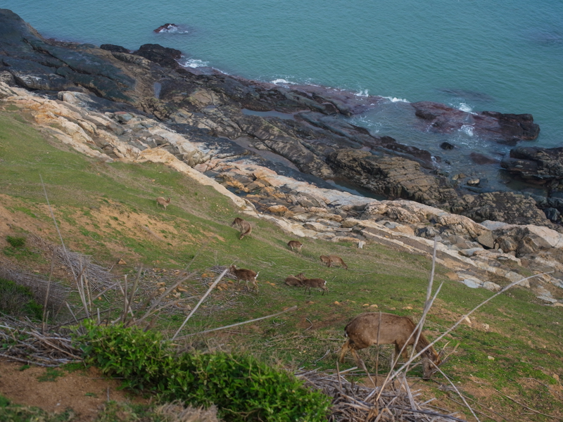 一上梅花公主號 (其實就是小小釣漁船),搖搖晃晃的不一會兒就到了大坵島。島上哺乳類數量最大的就是鹿,其次才是觀光客。大家對鹿的印象,可能停留在小鹿斑比或者是日本奈良的鹿,看起來可可愛愛、乾乾淨淨地。其實不然,島上的鹿雖然有固定時間施藥,但近看時會發現身上長了許多壁蝨,吸血吸得肥滋滋。真替這些鹿感到一點點的哀傷,其實他們也不願意來到大坵島當戰備存糧。